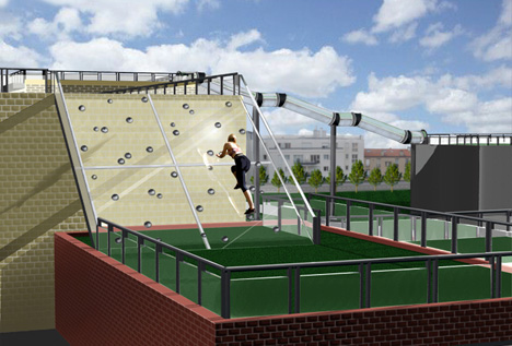 This is actually really cool. I've seen progress with newer buildings or updated rooftops of buildings, but I've never see this new concept of connecting buildings while still offering benefits to the rooftop. Imagine if we could go to the top of the Clift Building, put on some green then take a zipline to the top of the Squatters Building. Drop down for lunch the climb a wall on top of the JC Penney building. - I'm a fan already. Exercise, outdoors and more effecient use of rooftops - all great benefits.