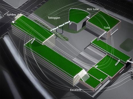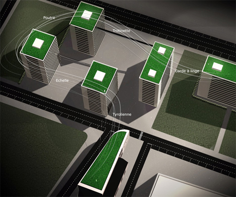 As the world goes green (or tries to) and micro devices get smaller and more efficient, inventive minds find ways to use rooftop space much more "interestingly". Aureline Ranson finds ways to connect buildings in fun ways - maybe that commute down the street would be more similar to an amusement park! A healthy fun commute.